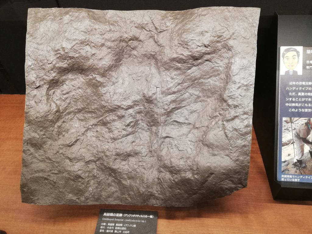 野外博物館のある手取層群北谷層の化石発掘現場で発掘されていた足跡化石。足跡サイズは、長さ8㎝、幅4.7㎝だそうです。