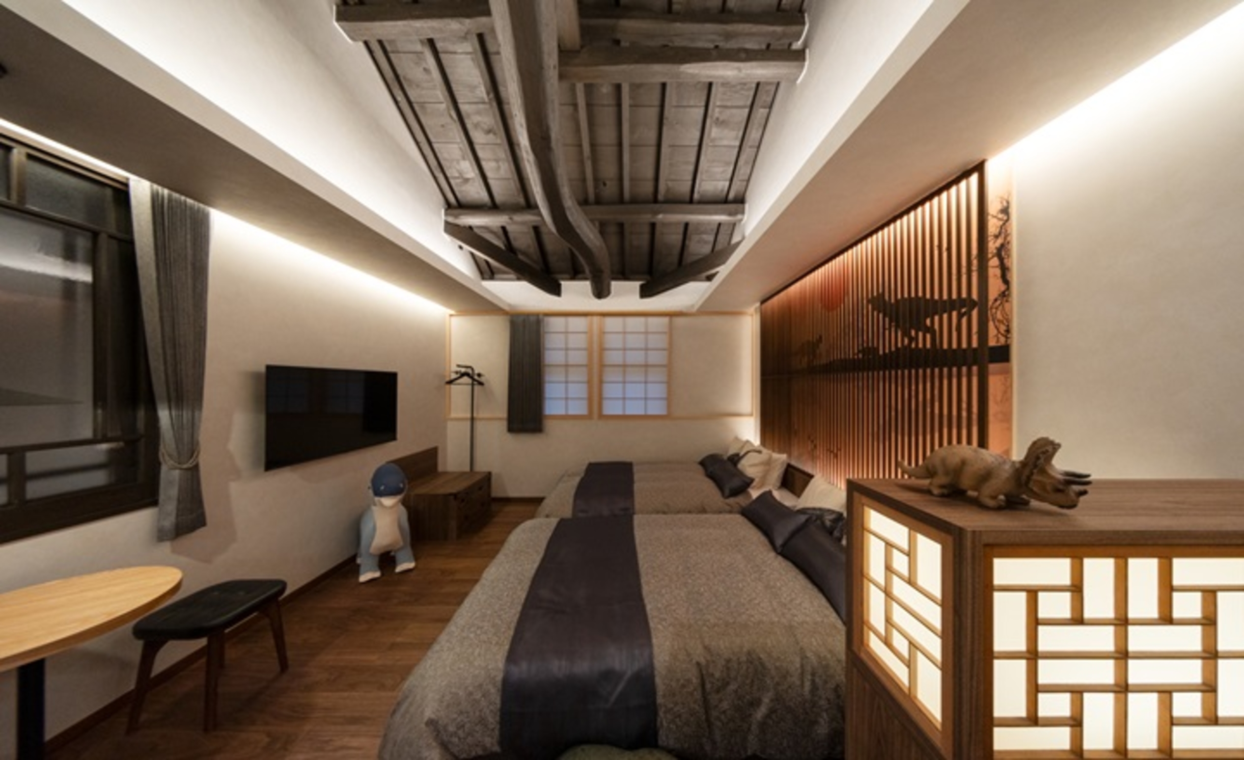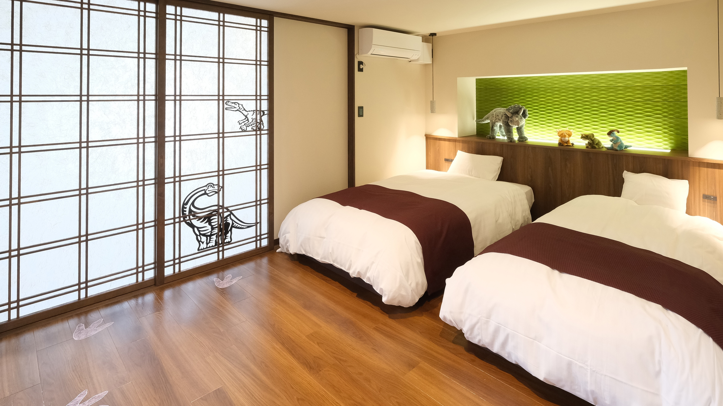 1室限定の恐竜ルームはレトロモダンな風情。8畳和室とベッドルームの二間続きとなっており、和室でお子さまは遊び、大人はゆっくりすることができます。