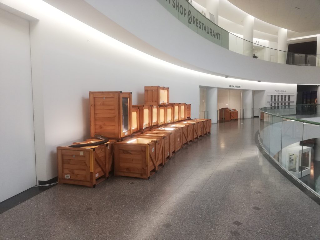 通路を更に進み、1Fに下るエレベーターの前です。エレベーターを降りた右手も収蔵庫がガラス張りになっています。