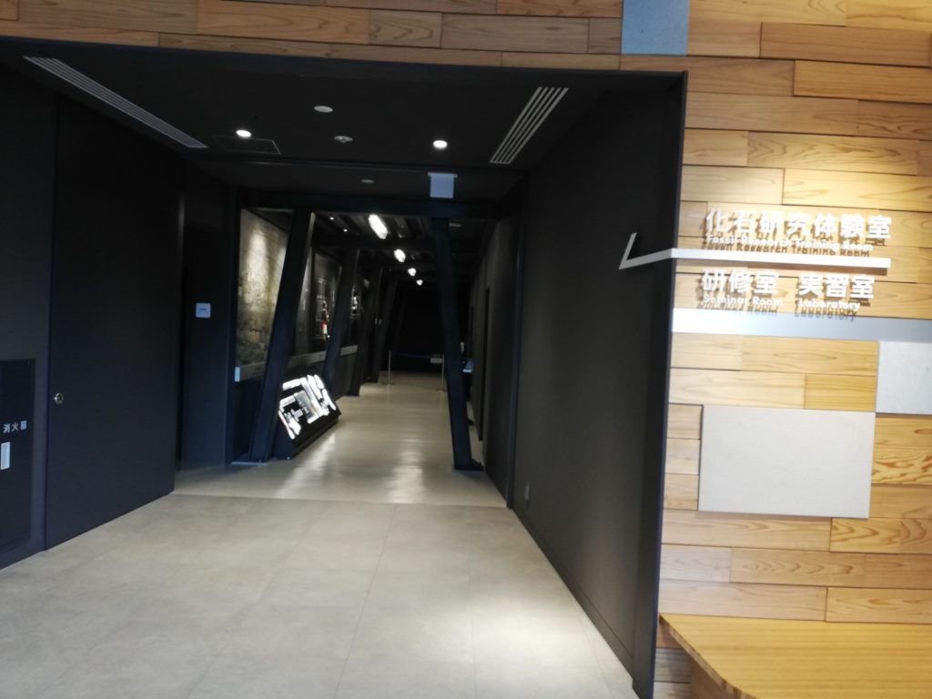 本館へ戻る途中、新館3Fには、化石研究体験室があります。化石研究体験は、別途、予約が必要です。しかし、体験室の前には、化石研究体験のチケットが無くても見られる展示が少しだけあります。
